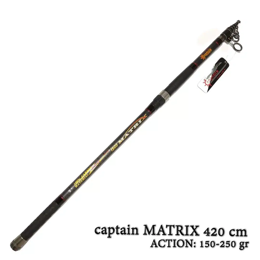 چوب ماهیگیری کاپیتان ماتریکس 4.20 متر با اکشن 150 الی 250 یکی از محبوبترین چوب ها بین ماهیگیران هست. این چوب به دلیل قدرت بالا، خوش ساخت بودن و کیفیت عالی بین ماهیگیران محبوبیت زیادی دارد . این چوب تحت لیسانس ایتالیا تولید شده و جنس چوب کربن 100% هست. چوب ماهیگیری کاپیتان ماتریکس MATRIX 420 به دلیل کیفیت ساخت بالا امکان پرتاب های های بسیار بلندی را به ماهیگیر میدهد و همچنین با توجه به اکشن زیاد آن این امکان را برای ماهیگیر می دهد در آب های با شدت جریان زیاد به راحتی ماهی های سنگین را مهار و صید کند. از این رو این چوب برای ماهیگیری به روش انتظاری و ساحلی و برای صید انواع ماهیان آب شور و آب شیرین بسیار مناسب هست.